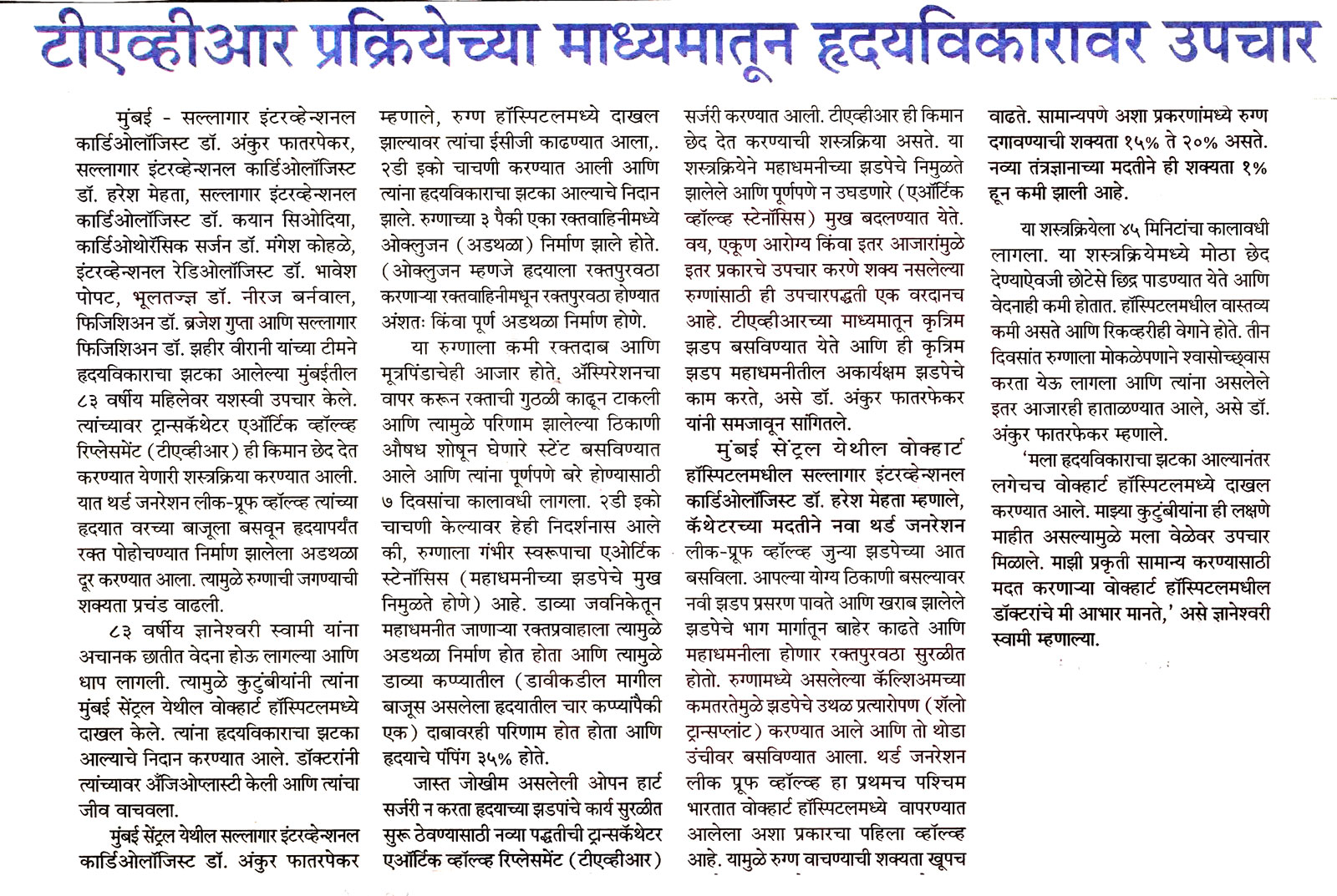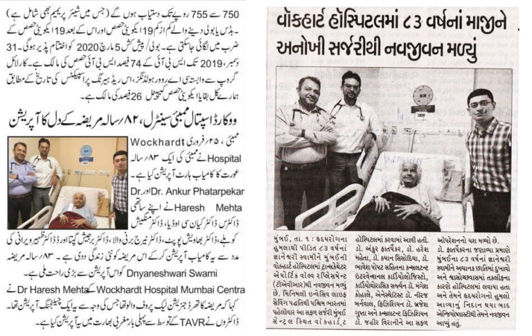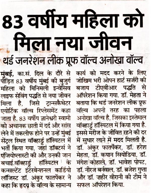 As covered by: Mid-Day – 83-year-old woman having heart attack treated with TAVR procedure The News Strike – WOCKHARDT HOSPITAL SUCCESSFULLY TREATED A 83-YEAR-OLD MUMBAI WOMAN SUFFERING FROM HEART ATTACK Apeksha Sandesh – Wockhardt Hospital Successfully Treated A 83-Year-Old Mumbai Woman Suffering from Heart Attack With 3rd Generation Medtronic Leak-Proof Valve Via TAVR procedure Health Care Radius – Wockhardt Hospital treated an octogenarian woman suffering from heart attack with 3rd generation leak-proof valve via TAVR procedure Saradhy – Wockhardt Hospital Successfully Treated A 83-Year-Old Mumbai Woman Suffering from Heart Attack With 3rd Generation Medtronic Leak-Proof Valve Via TAVR procedure Indian Health Guru – TAVR Procedure Has Given A New Lease Of Life To 83-Year-Old Lady Suffering From Heart Attack Mumbai News Express – Wockhardt Hospital Successfully Treated A 83-Year-Old Mumbai Woman Suffering from Heart Attack With 3rd Generation Medtronic Leak-Proof Valve Via TAVR procedure